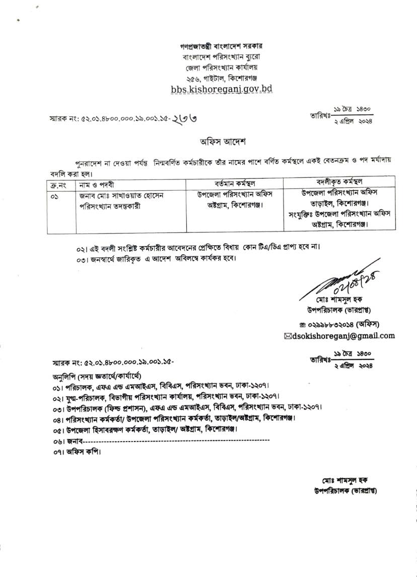 | ৭ | জনাব মোঃ সাখাওায়াত হোসেন, পরিসংখ্যান তদন্তকারী এর বদলি আদেশ | | | ০২-০৪-২০২৪ | দেখুন |